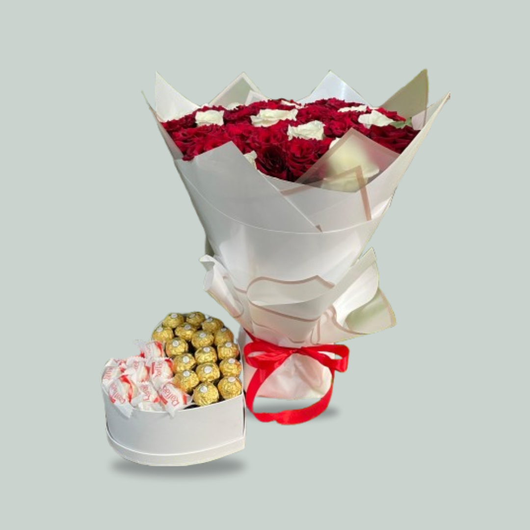 Un bouquet raffiné de roses rouges et blanches accompagné d’un coffret de chocolats en forme de cœur, une alliance parfaite d’amour et de gourmandise.